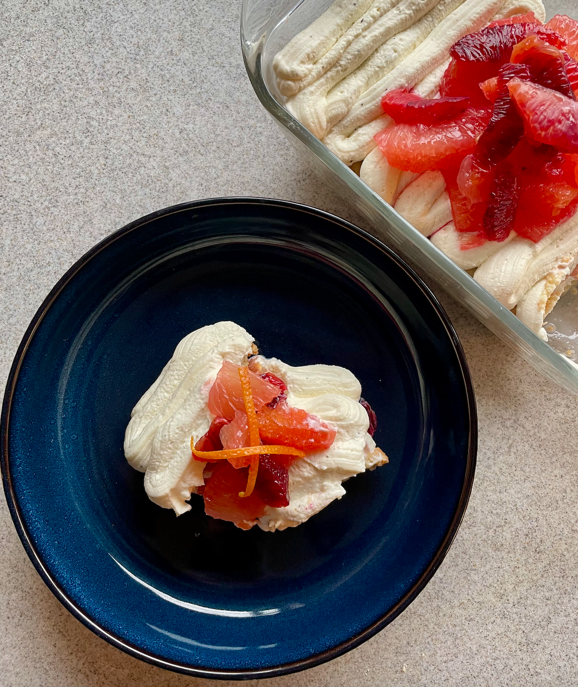 You can use any citrus you like here- I favor a combination of oranges/blood oranges and grapefruit. I’ve listed in the ingredients that you should supreme your citrus before beginning this recipe- that’s just the process of completely cutting away the outer peel and pith of the fruit and then removing the thin skin around each segment- this really is a necessary step, if a little tedious. It makes the texture of the trifle a lot more appealing. There’s a great step-by-step HERE if you’re not sure how. As far as your mascarpone cream goes, if you don’t have a piping bag (or don’t feel like using one), you can spread the cream over the trifle with a spatula instead- I just prefer the look of it when piped. This takes a little over an hour to make + a few hours to rest and soak in the flavors and makes 5-6 servings.